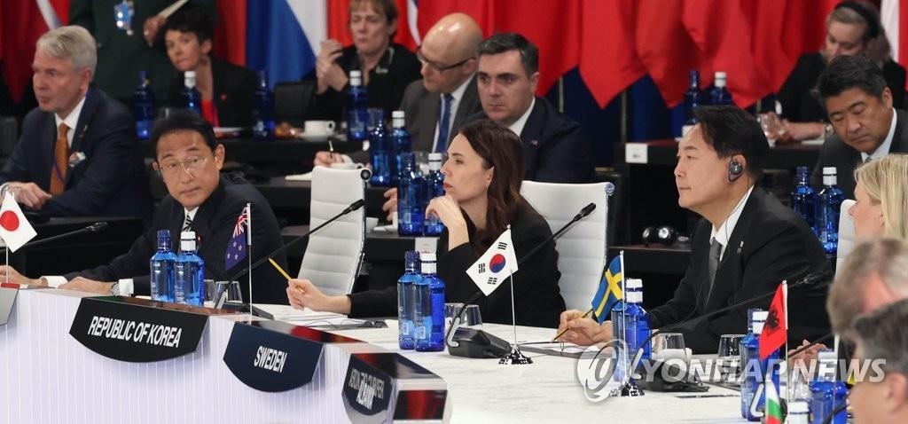 2022年6月29日,在西班牙馬德里,韓國總統尹錫悦(前排右一)、日本首相岸田文雄(前排左一)等亞太夥伴國領導人受邀出席北約峯會,但韓日兩位領導人並未單獨進行雙邊會談。