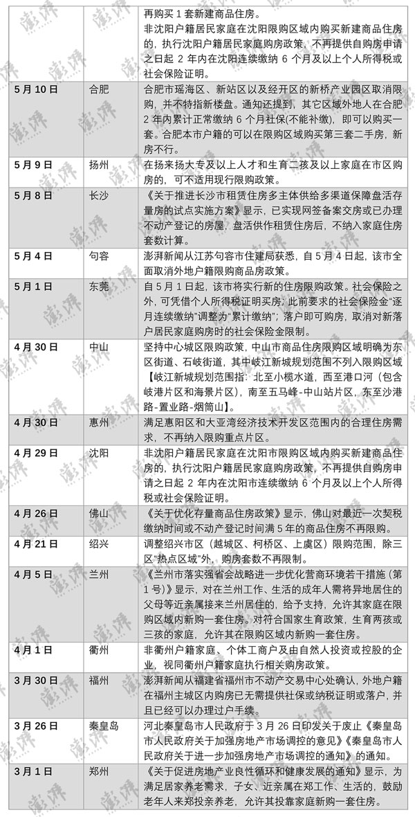 據澎湃新聞不完全統計,今年以來,包括鄭州、秦皇島、福州、衢州、蘭州、紹興、佛山、瀋陽、惠州、中山、東莞、句容、長沙、揚州、合肥、瀋陽、杭州、湖州、銀川、大連、哈爾濱、唐山、無錫、江門、廣州、九江、南京、武漢、成都、廊坊、海寧、蘇州、西安、濟南、青島、天津等36個城市調整了樓市限購政策。