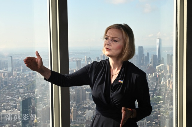當地時間9月20日,美國紐約,英國首相特拉斯參觀紐約帝國大廈時接受媒體採訪。圖自澎湃影像