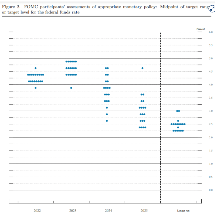 預測中位值顯示,明年利率預期為4.6%,高於之前市場預計峯值4.5% 圖源美聯儲