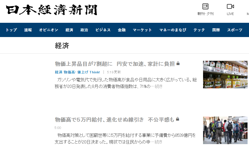 物價上漲,低收入的日本民眾生活艱難 日本經濟新聞網頁截圖