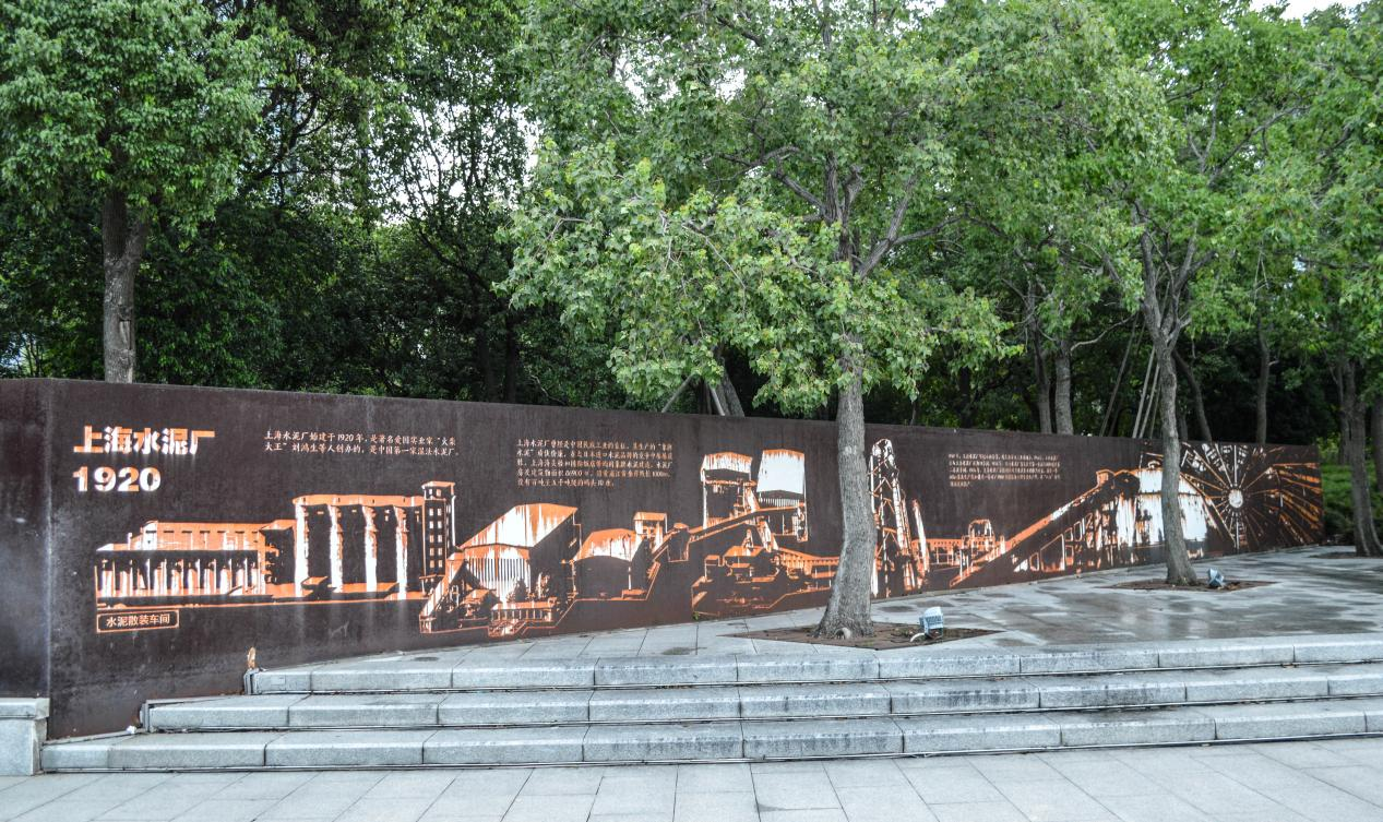 徐匯濱江日暉港橋入口處的鏽色牆面書寫着工業歷史
