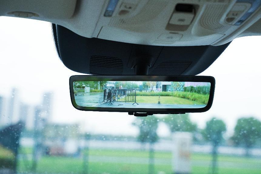 數字內部後視鏡取代了傳統物理後視鏡,將車尾影像以流媒體形式播放,畫面清晰細膩,不僅能避免後方盲區,還能在夜間行駛時免去後車遠光的打擾。當然,如果駕駛者不習慣也可以一鍵切換成常規鏡面,還可通過按鍵進行視野亮度和仰角角度的調節。
