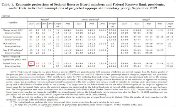 這預示着什麼呢?這預示着在昨夜議息會議宣佈加息75個基點至3.0%-3.25%區間後,美聯儲今年餘下兩場議息會議很可能還需再加息125個基點——最有可能分為11月加息75個基點、12月加息50個基點來進行,這大大超出了市場的預期。