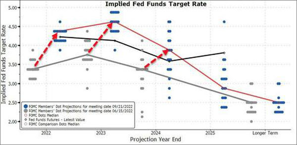 這個數字大大超出了市場人士的預期——在點陣圖中,超過半數的委員認為2022年政策利率就應至少達到4.25-4.50%。