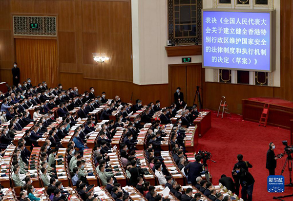 十三屆全國人大三次會議表決《全國人民代表大會關於建立健全香港特別行政區維護國家安全的法律制度和執行機制的決定(草案)》(2020年5月28日攝)。新華社記者 丁海濤 攝