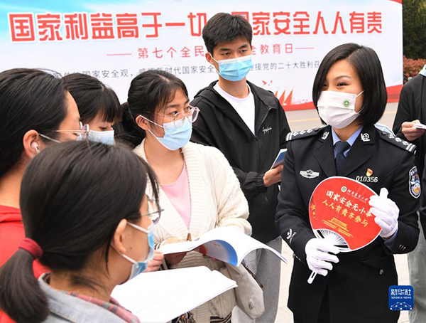 在河南農業大學開展“全民國家安全教育進校園”宣傳教育活動中,鄭州市公安局民警與學生們互動(2022年4月15日攝)。新華社發(劉書亭 攝)
