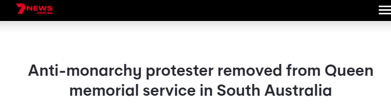 (觀察者網訊)據澳大利亞七號台新聞報道,9月22日是澳大利亞為伊麗莎白二世舉行的全國哀悼日。當天,在南澳大利亞州首府阿德萊德,一名男子手舉“廢除君主制”的標語並將此話寫在了弔唁英女王的留言簿上,隨後他被警察驅逐出南澳州總督府。