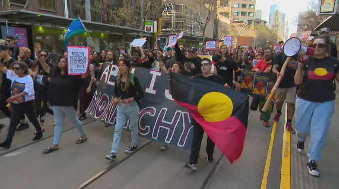 在墨爾本市中心,1000多人舉着澳大利亞原住民旗幟和相關標語走上街頭,高喊推翻君主制的口號,還有人將紅色油漆潑在澳大利亞國旗和英國領事館外。