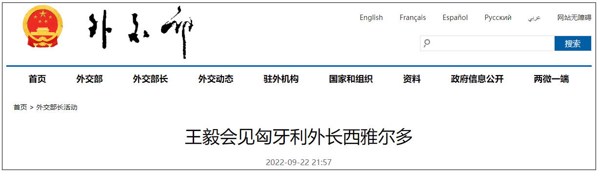 外交部網站22日消息,當地時間2022年9月21日,國務委員兼外長王毅在紐約出席聯合國大會期間會見匈牙利外長西雅爾多。