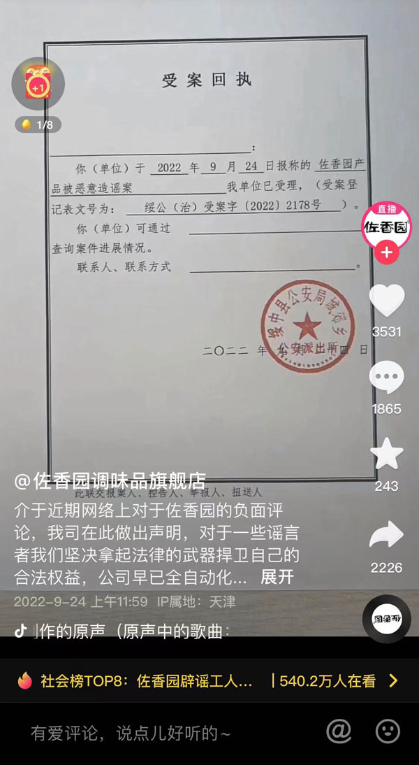 針對此事,遼寧帝華味精食品有限公司24日發佈公告,回應網傳“工人往黃豆醬裏大小便”一事,稱網上不實言論均系誹謗,當前已向公安機關報案,並於同日中午在其官方抖音平台上發佈了警方受案回執。