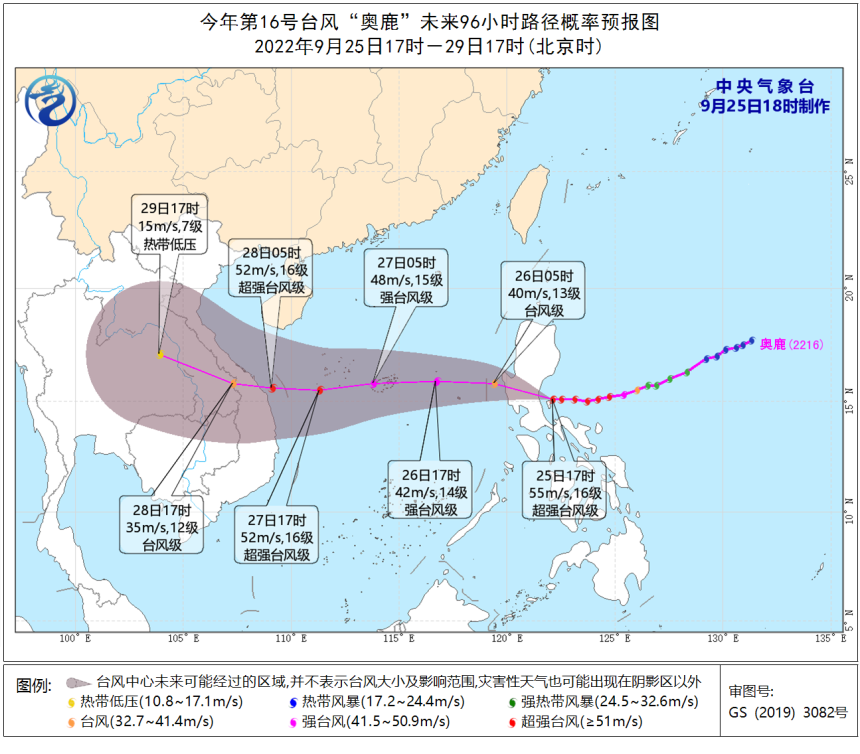 預計,“奧鹿”將以每小時25公里左右的速度向西偏北方向移動,將於今天晚上在菲律賓呂宋島東部沿海登陸(48~55米/秒,15~16級,強颱風級或超強颱風級),今天夜間穿過呂宋島,強度有所減弱,26日早晨到上午進入南海中東部海域,之後向偏西方向移動,逐漸向越南東部沿海靠近,強度還將有所加強,28日早晨到上午在越南東部沿海登陸(48~52米/秒,15~16級,強颱風級或超強颱風級),登陸後強度快速減弱。中央氣象台9月25日上午發佈颱風藍色預警。