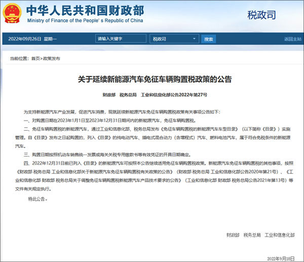 據財政部網站9月26日消息,財政部、税務總局、工業和信息化部發布《關於延續新能源汽車免徵車輛購置税政策的公告》。
