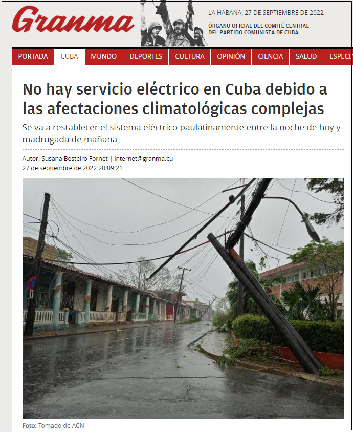 (觀察者網 訊)據古巴共產黨中央機關報《格拉瑪報》消息,受颶風“伊恩”影響,當地時間9月27日晚間,古巴發生全國性停電,目前電力系統正在搶修中,預計在次日上午之前恢復。