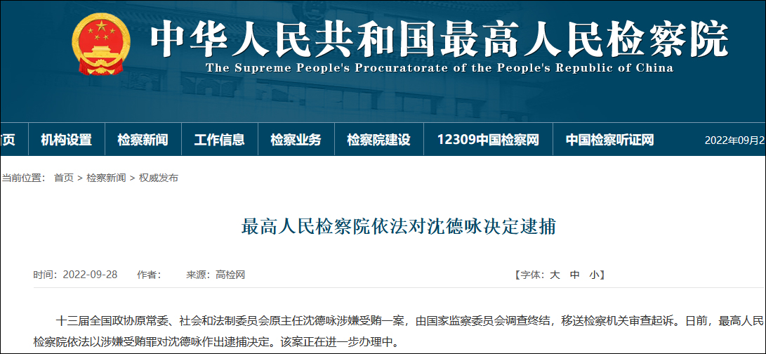 據最高人民檢察院網站9月28日消息,十三屆全國政協原常委、社會和法制委員會原主任沈德詠涉嫌受賄一案,由國家監察委員會調查終結,移送檢察機關審查起訴。日前,最高人民檢察院依法以涉嫌受賄罪對沈德詠作出逮捕決定。該案正在進一步辦理中。