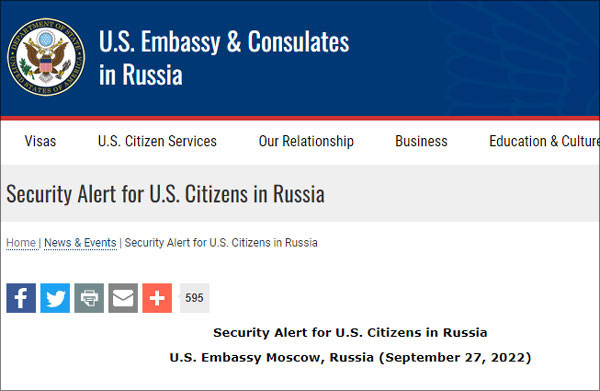 美駐俄大使館援引了俄羅斯上週發佈的部分動員令,警告稱俄羅斯有可能拒絕承認具有俄羅斯與美國雙重國籍的人、阻礙他們獲得美國領事協助,以及離開俄羅斯。該公告稱,這些擁有雙重國籍的人可能會被俄方徵召服役。