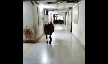 另一段視頻顯示,有一頭牛漫步在政府大樓的長通道里,並遇到了另一頭坐在測量員辦公室外的牛。