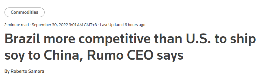 “巴西在將農產品(此處指的是大豆)運往目的地方面變得比美國更具競爭力”,阿布魯表示,他説的主要是“巴西的最大市場——中國”。