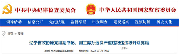 中央紀委國家監委網站30日消息,日前,經中共中央批准,中央紀委國家監委對遼寧省政協原黨組副書記、副主席孫遠良嚴重違紀違法問題進行了立案審查調查。