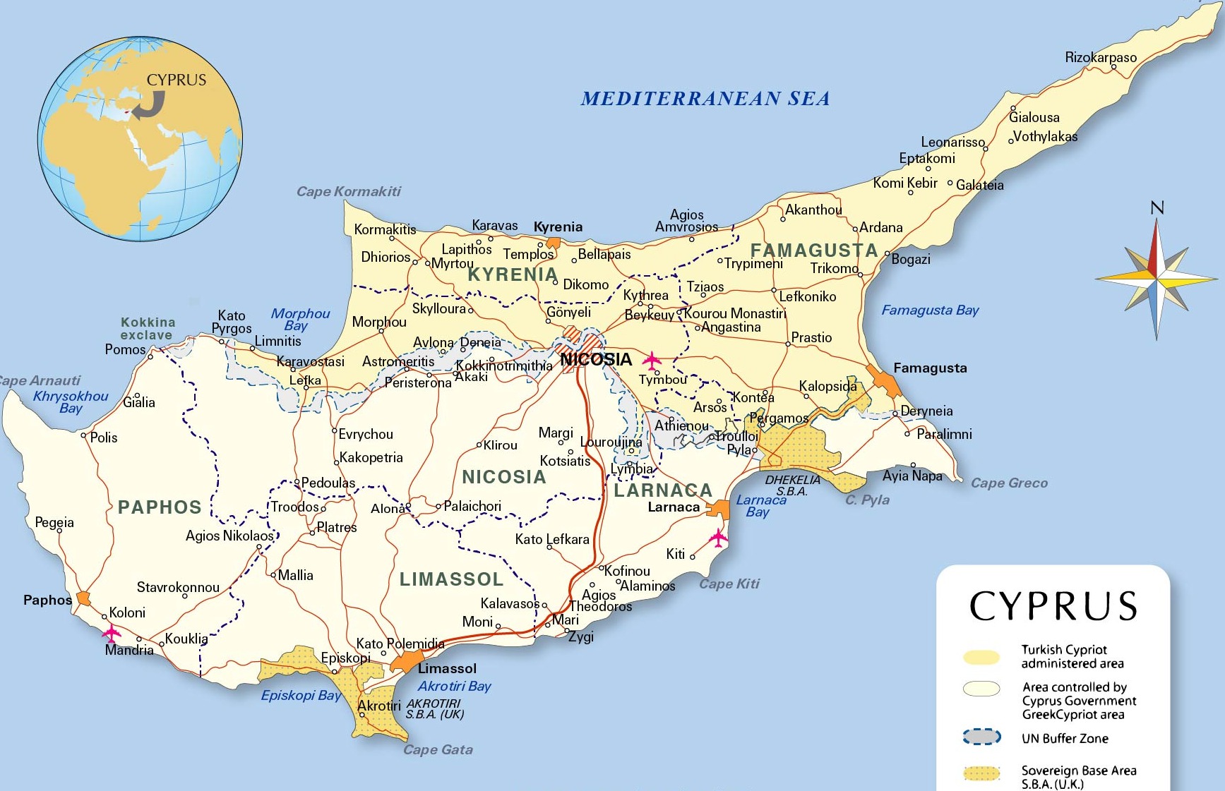 塞浦路斯地圖,北部為親土耳其分裂政府,南部為塞政府控制區,深黃色是英國的軍事基地