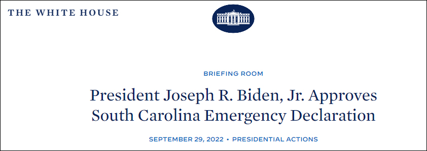 白宮網站上關於“拜登批准南卡羅來納州進入緊急狀態”的消息截圖
