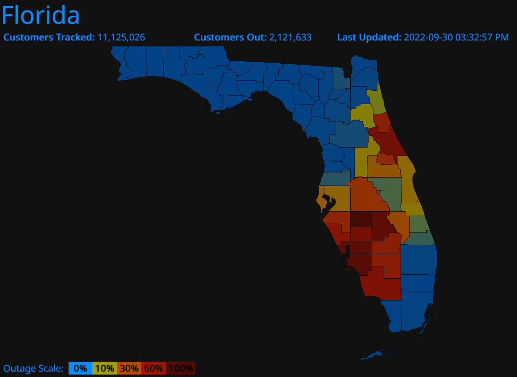 該網站稱,佛羅里達州哈迪縣、夏洛特縣和李縣幾乎完全斷電,西南部各縣大部分斷電。
