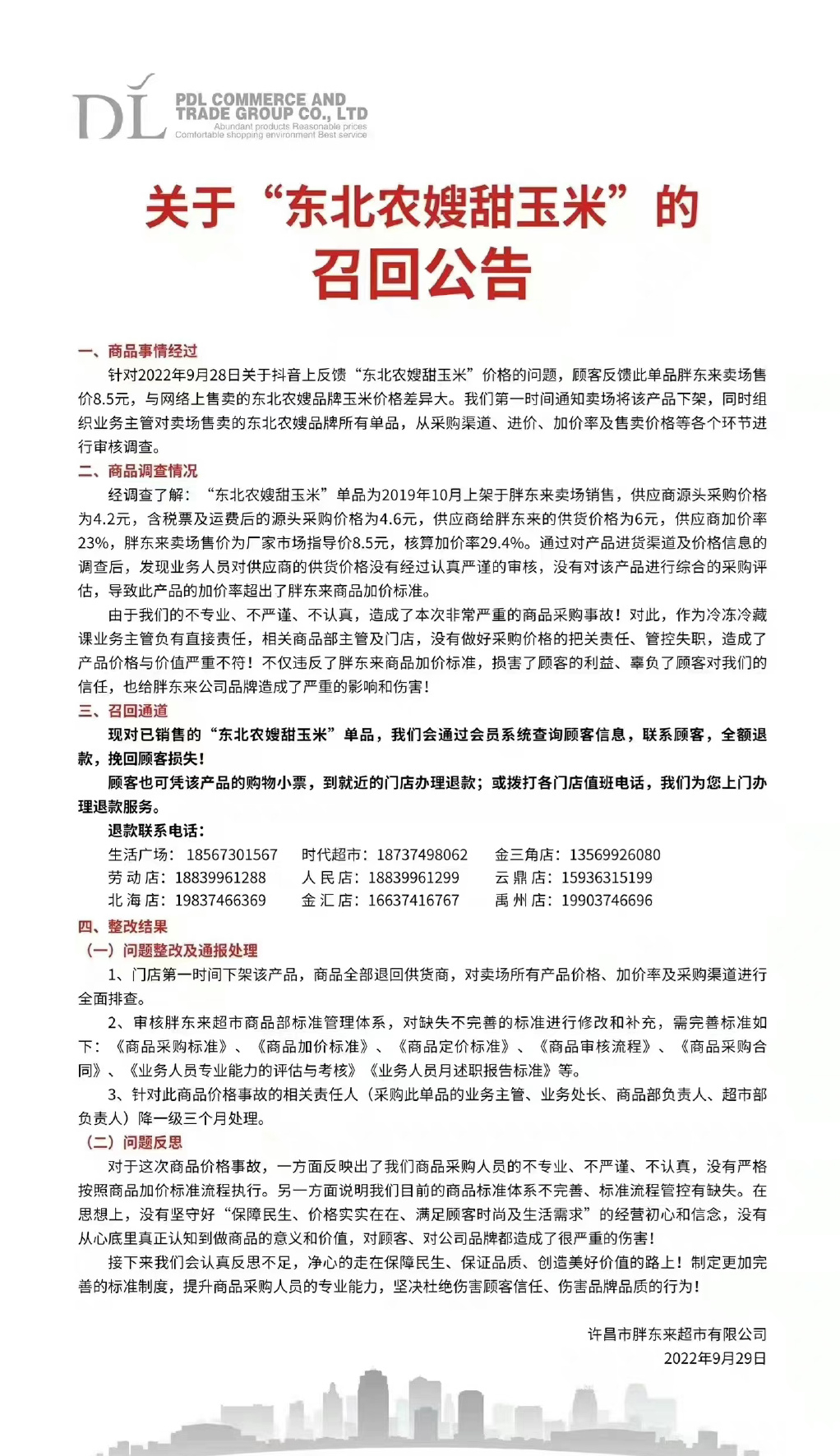 視頻發出次日,胖東來就發佈了關於“東北農嫂甜玉米”的召回公告。公告顯示,“東北農嫂甜玉米”供應商源頭採購價格為4.2元,含税票及運費後的源頭採購價格為4.6元,供應商給胖東來的供貨價格為6元,供應商加價率23%,胖東來賣場售價為廠家市場指導價8.5元,核算加價率29.4%。