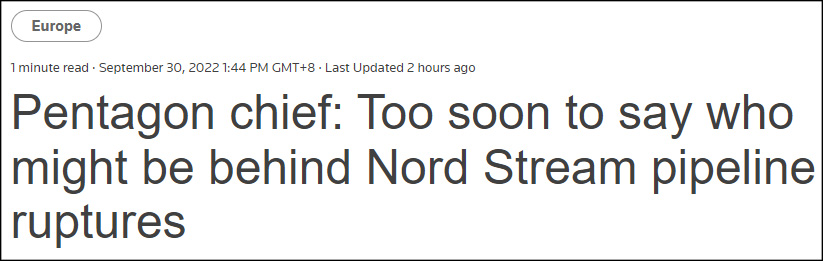 (觀察者網訊)圍繞“北溪”管道泄露事件真相的猜測仍在繼續,面對外界越來越多的質疑,美國政府正極力撇清與此事的關係。據英國路透社9月29日報道,美國國防部長奧斯汀當天接受媒體採訪時宣稱,“北溪”事件仍有待進一步調查,現在推測“幕後黑手”的身份還為時過早。