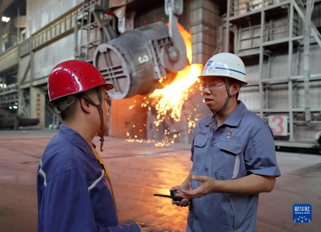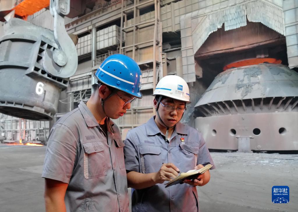 邯寶鍊鋼廠特檔技術主管、轉爐車間副主任唐笑宇(右)在轉爐車間與工友交流(2022年9月7日攝)。新華社記者 楊世堯 攝