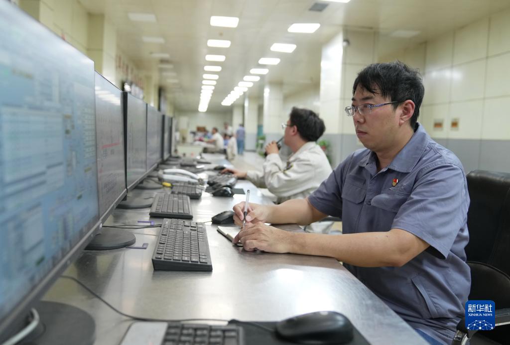 邯寶鍊鋼廠特檔技術主管、轉爐車間副主任唐笑宇(右)在轉爐車間控制室工作(2022年9月7日攝)。新華社記者 楊世堯 攝