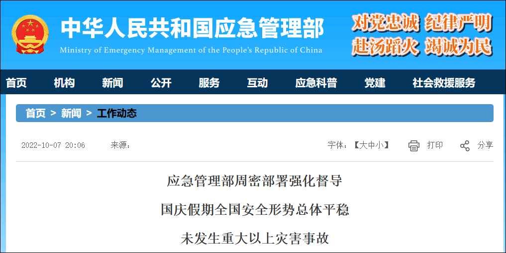 據應急管理部網站10月7日消息,針對今年國慶假期嚴峻複雜的安全形勢,應急管理部深入貫徹落實習近平總書記重要指示精神,按照李克強總理等中央領導同志重要批示要求和全國安全生產電視電話會議安排部署,以“時時放心不下”的責任感,周密安排部署,強化督導落實,全力做好安全防範和應急處置各項工作,為羣眾歡度國慶假期營造安全穩定的社會環境。截至10月7日18時,全國安全形勢總體平穩,未發生重大以上生產安全事故和自然災害。