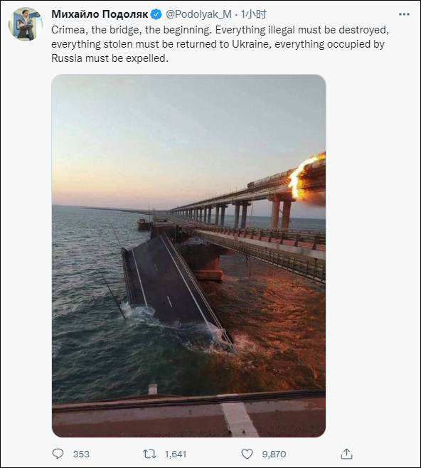 烏總統辦公室主任顧問波多利亞克8日在推特上發文稱,克里米亞大橋事件是一個“開始”。“所有非法的事物都必須被摧毀,所有被盜取的事物都必須歸還烏克蘭,所有被俄羅斯佔領的必將被驅逐”。