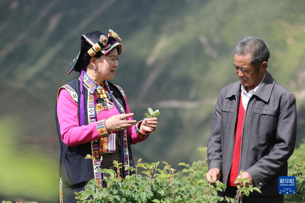 9月25日,陳望慧在四川阿壩州小金縣新橋鄉共和村與村民喻福良探討種植經驗。新華社記者 劉瓊 攝