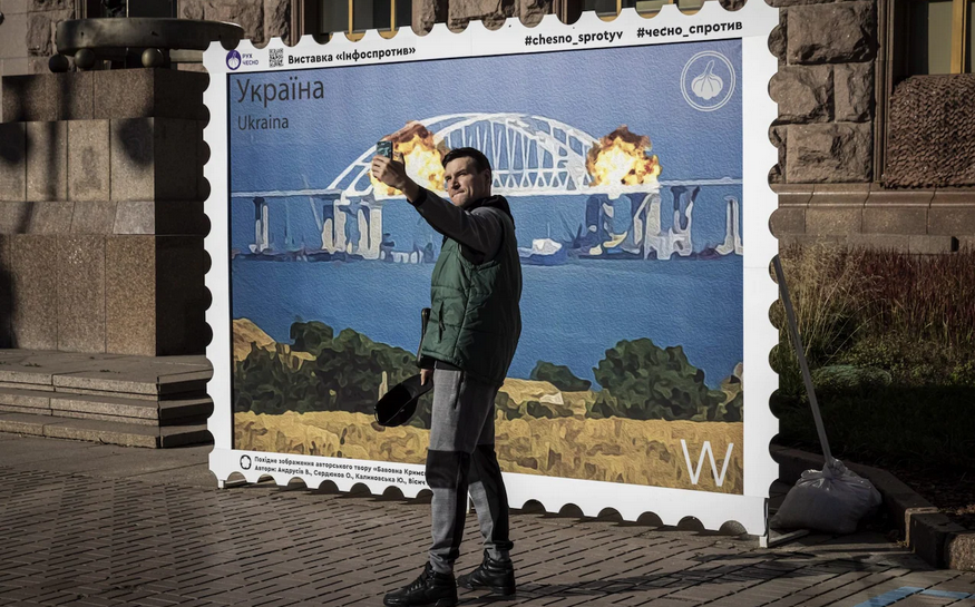 綜合白俄媒體“NEXTA”、英媒《電訊報》等8日報道,克里米亞大橋發生爆炸後,烏克蘭首都基輔的市政廳附近出現了一塊以“克里米亞大橋被炸”為主題設計的背景板,當天有不少人前來打卡拍照。