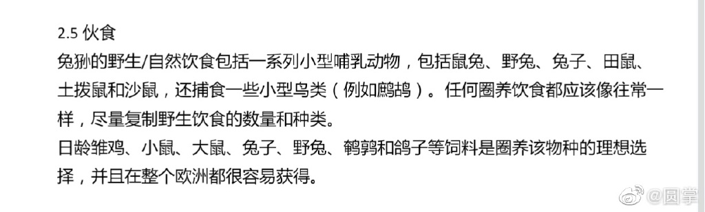 @圓掌 所發微博附上的一份兔猻伙食資料截圖顯示:“兔猻的野生/自然飲食包括一系列小型哺乳動物,包括鼠兔、野兔、兔子、田鼠、土撥鼠和沙鼠,還捕食一些小型鳥類(例如鷓鴣)。任何圈養飲食都應該像往常一樣,儘量複製野生飲食的數量和種類。日齡雛雞、小鼠、大鼠、兔子、野兔、鶴鶉和鴿子等飼料是圈養該物種的理想選擇”。