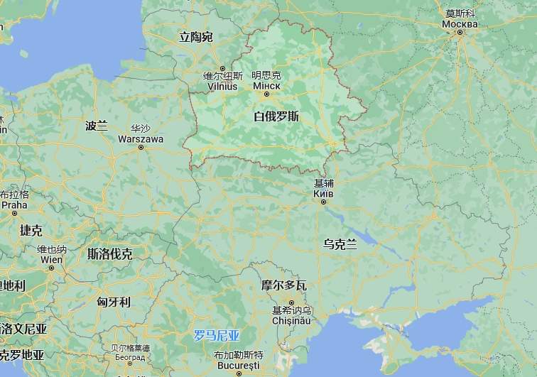 白俄羅斯西部與波蘭、立陶宛接壤,南部與烏克蘭接壤。圖片來源:谷歌地圖