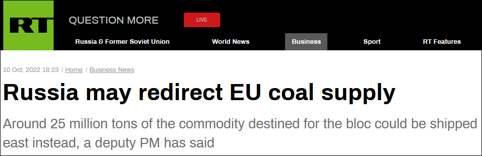 【文/觀察者網 熊超然】據“今日俄羅斯”(RT)10月10日報道,俄羅斯聯邦副總理亞歷山大·諾瓦克(Aleksandr Novak)當天在《能源政策》雜誌上發表的一篇文章中寫道,在歐盟暫停從俄羅斯購買煤炭之後,俄羅斯煤炭供應商可能會將貿易流向轉移至其他地區。