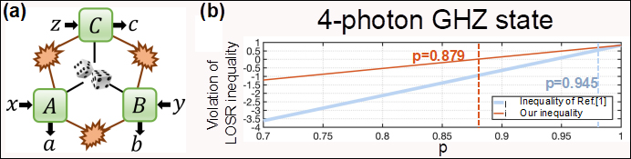 在量子資源理論中,LOCC並不是唯一可以用來定義糾纏資源的免費操作,在去除經典通信後,一個更為自然的定義是基於LOSR的理論框架。在實驗中,研究組先驗證了三體糾纏結構的非局域性。該三體系統的LOSR局域模型允許三體之間具有共享隨機性,並允許對任意兩體之間的關聯不設限,即允許其關聯可以是量子關聯,也可以具有更為廣泛的不依賴量子力學描述的廣義概率理論(Generalized probabilistic theory)所允許的關聯。研究組聯合Marc-Olivier Renou等人對此前相關理論工作中提出的LOSR非局域性不等式進行改進,針對多光子實驗中常見的白噪聲提出了魯棒性更強的不等式,並在實驗中利用自主研製的“三明治型”高保真度多光子糾纏源[PRL115, 260402 (2015)]以26.3個標準差的違背驗證了真三體LOSR非局域性。研究組進一步在四體情形實驗違背了真四體LOSR不等式,實驗排除了基於共享隨機性和三體廣義關聯的局域性模型,展示了真四體非局域性。這些實驗結果表明僅兩體或三體非局域關聯無法解釋自然界產生的所有關聯。該工作中提出的不等式可以拓展到任意N體情形,而製備高保真度糾纏源的方法為實驗展示更大量子系統非局域性打下基礎。