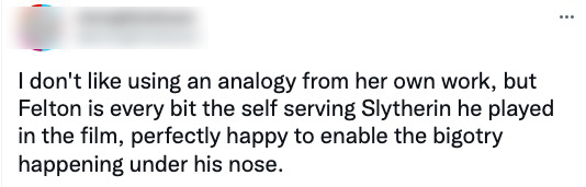 一位跨性別羣體權益支持者在推特發文稱:“這麼説J.K.羅琳才是被攻擊的那個唄,她每天對跨性別羣體的攻擊卻被輕易地忽略了?滾開吧,湯姆·費爾頓也可以滾了,小爬蛇。”