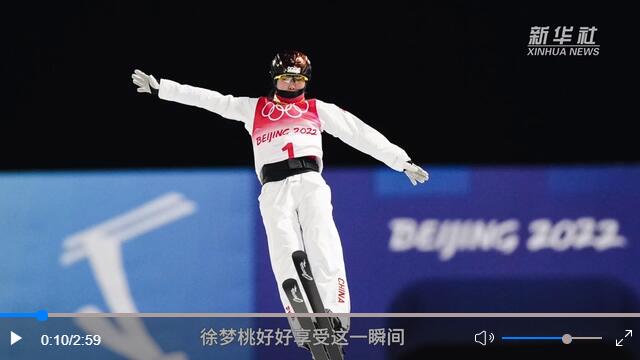 無悔追夢,放手一搏!徐夢桃果斷選擇將最後一跳難度拉滿。那一天,又是大風、低温,但她最終完美落地,不負期望,為中國女子自由式滑雪空中技巧實現了冬奧金牌“零”的突破!