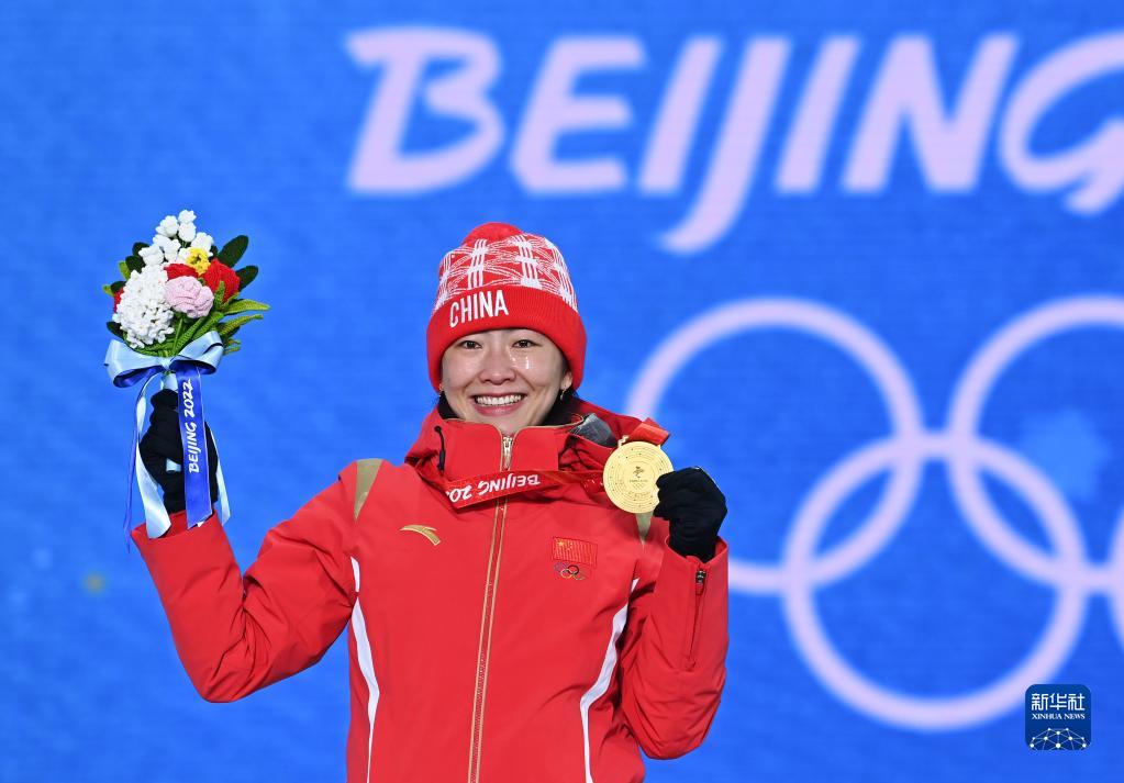 徐夢桃在張家口賽區頒獎廣場舉行的北京2022年冬奧會自由式滑雪女子空中技巧獎牌頒發儀式上慶祝(2022年2月15日攝)。新華社記者胡虎虎攝