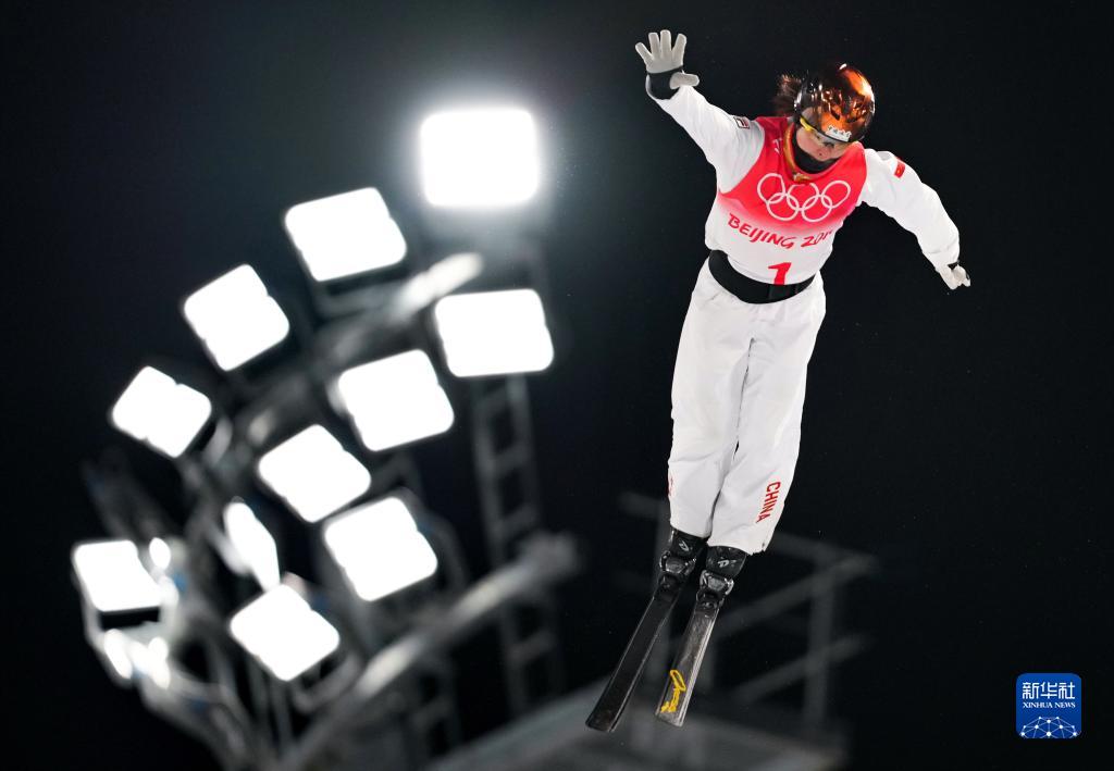徐夢桃在張家口雲頂滑雪公園舉行的北京2022年冬奧會自由式滑雪女子空中技巧決賽中(2022年2月14日攝)。新華社記者牟宇攝