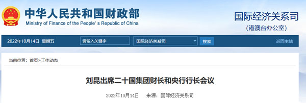 據財政部網站消息,2022年10月13日至14日,二十國集團(G20)財長和央行行長會議在美國華盛頓以線上線下相結合方式召開。會議主要就全球經濟、國際金融架構、可持續金融、基礎設施投資、國際税收和金融部門等議題進行了討論。財政部部長劉昆視頻出席會議併發言,副部長王東偉陪同出席。