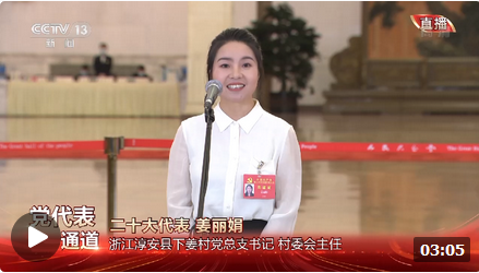 二十大代表 浙江淳安縣下姜村黨總支書記 村委會主任 姜麗娟:總書記給下姜村指出了一條綠色發展之路,這些年通過農文旅融合,下姜村闖出了一條適合我們自己的增收致富之路。現在,鄉村老百姓在家門口就能實現就業;更多年輕人和我一樣回到家鄉創業,每年我們都可以拿到村裏的分紅;通過5G遠程醫療,在家就能請省城的專家醫生給我們看病。