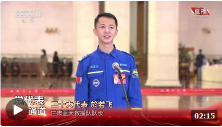 **二十大代表 甘肅藍天救援隊隊長 於若飛:**在我們隊伍中,絕大多數人都是有自己的本職工作。但是因為我們有共同的理想和信念,每一次有災害發生的時候,我們都會聚集在一起來貢獻我們的力量。過去十年裏,我和我的隊友們參與到了四川雅安地震、雲南魯甸地震、尼泊爾地震等國內外的救援行動,參與挽救倖存者81人,救治600餘人。