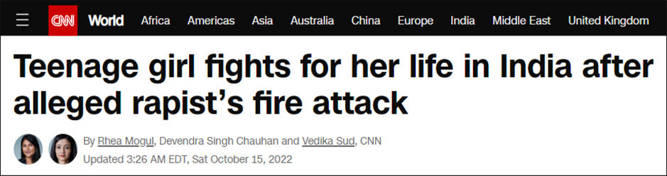 (觀察者網訊)據美國有線電視新聞網(CNN)10月15日報道,印度一名15歲懷孕女孩正在印度北部一家醫院掙扎求生,她此前被兩名家庭成員縱火焚燒,其中一人即女孩的堂兄也被指控性侵了她並致其懷孕。