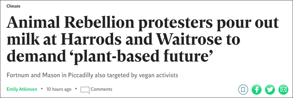 在倫敦皮卡迪利大街的Fortnum & Mason商店,另一組抗議者被拍到將牛奶倒在地面和其他乳製品上。