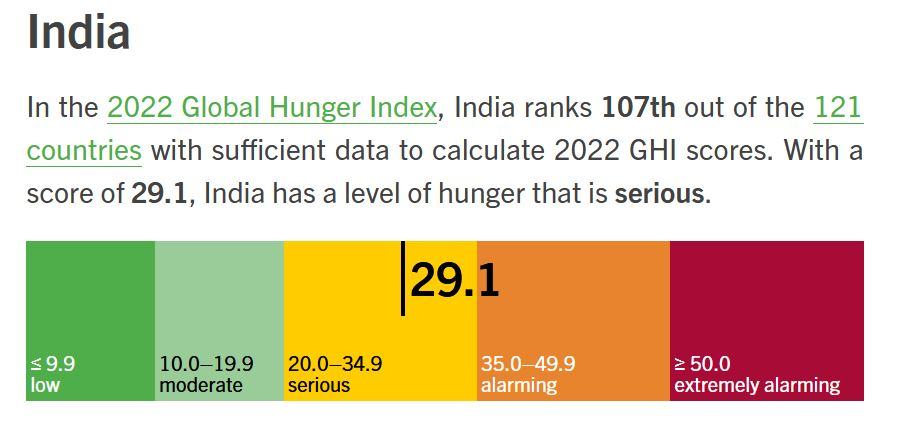 最新公佈的GHI指數中,印度為29.1,排名世界107位