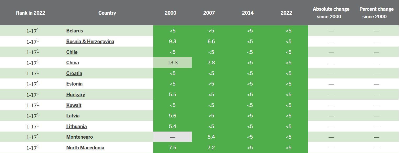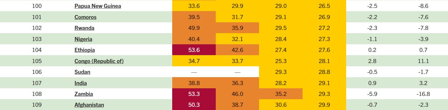 與周邊國家相比,印度的表現也不算良好。印度的排名低於巴基斯坦(99位)、孟加拉國(84位)、斯里蘭卡(64位)和尼泊爾(81位),僅比阿富汗高兩位。亞洲範圍內,中國和科威特排名最高,指數均小於5。