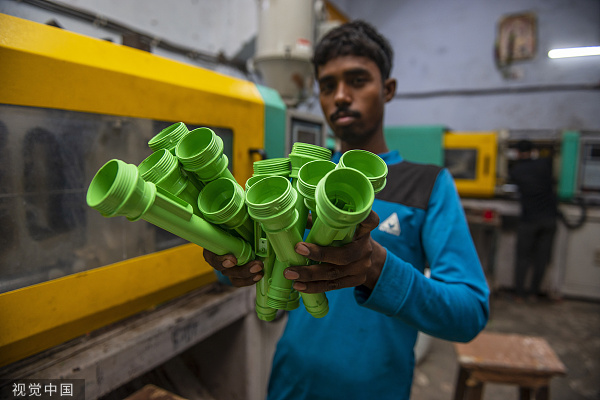 印度新德里塑料製品廠工人辛苦勞作。圖源:視覺中國
